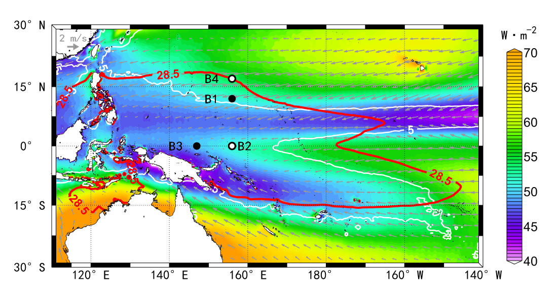 图2:西太平洋暖池中TPOS海气浮标位置。彩色背景表示2010至2019年的10年气候态平均净长波辐射(单位:W·m‒2),灰色箭头表示气候态海表面风矢量(单位:m·s‒1),红线表示气候态28.5 °C的海表面等温线。白线表示从卫星获取的5 mm/day的气候态平均海表面降水量,表示热带辐合带(ITCZ)的边界。