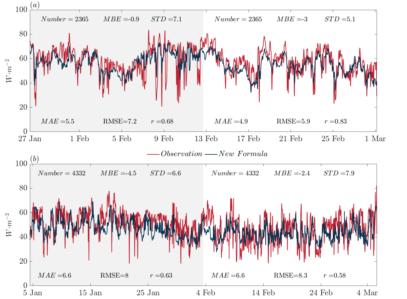 图3:观测与参数化估算的净长波辐射时间序列对比。(a)浮标 1 在 1–3 月期间的观测 NLW(红线)与新参数化方案估算结果(蓝线)的对比,灰色阴影表示用于参数化建立的样本时段,右侧为独立验证时段;(b)同(a),但对应浮标 3。